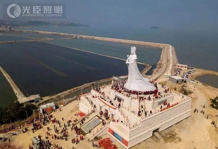 結(jié)合參照物體的亮化背景,媽祖像高度約30米左右,實(shí)現(xiàn)媽祖石像整體打亮,光臣照明為此定制一款大功率400W投光燈,DMX512金黃外控洗墻燈及LED藍(lán)光小射燈作為本次媽祖亮化燈具,在白總與光臣照明的同共努力下,效果呈現(xiàn)與設(shè)計(jì)方案效果還原度高達(dá)99%。