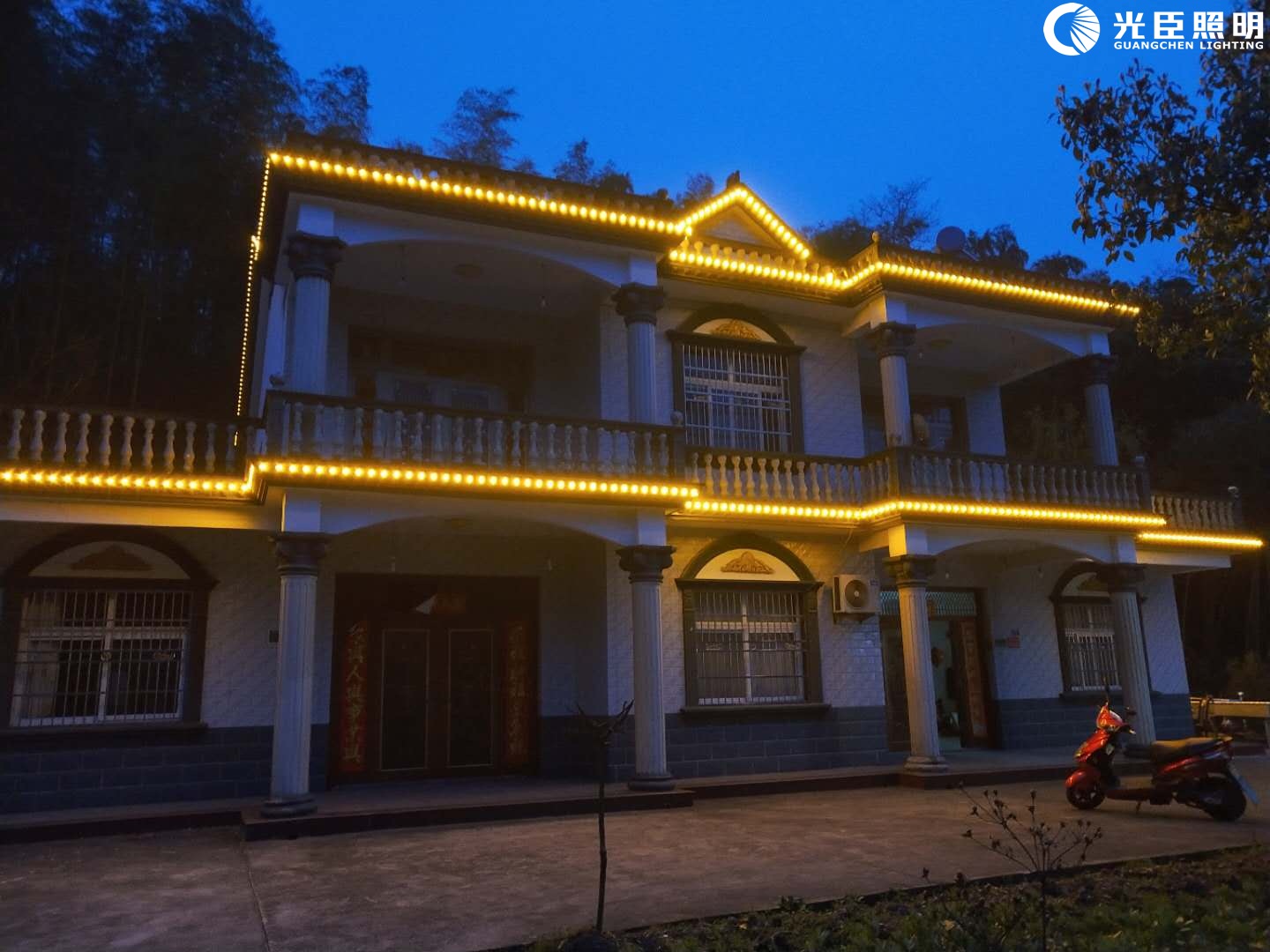 此次的項目是去年合作過一個地產(chǎn)樓盤蔡總自家房子亮化。通過上個項目,蔡總對我們產(chǎn)品質(zhì)量和服務(wù)都是豎拇指的。因為這次是鄉(xiāng)村的房子,蔡總那邊表示不要過于花哨,想要那種星星點點的感覺。有了上個項目的磨合溝通,業(yè)務(wù)員和蔡總這邊很默契,很快制定了方案,選定光臣直徑3公分點光源圍著樓體走一圈。燈光的色溫和布點位置與建筑形體、色彩和景觀空間完美結(jié)合,形成了極強的高端感受和靜謐氛圍。