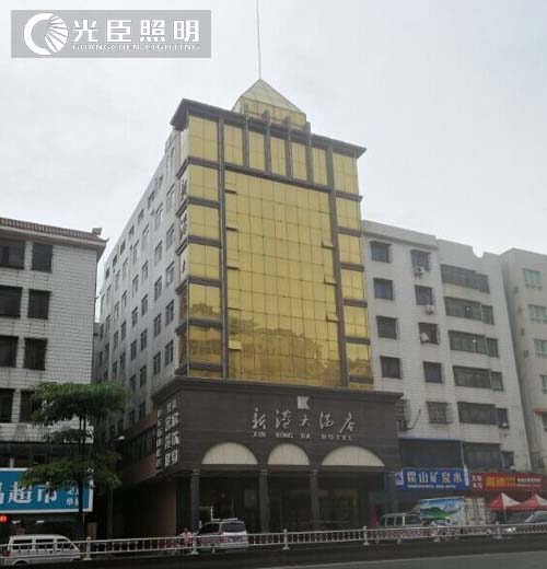 本次酒店外墻亮化選用了LED線(xiàn)條燈做為簡(jiǎn)單的輪廓勾勒、LED星光燈及點(diǎn)光源作為墻面點(diǎn)綴燈具,一閃一閃的效果相當(dāng)耀眼,由于墻角安裝燈具的面積有限,光臣照明特意定制一批與墻面安裝尺寸相符的LED墻角燈,發(fā)光效果十分好看。為了讓酒店塔頂顯得更加奪目,添加了金燦燦的36W金黃光洗墻燈突顯它的造型感。
