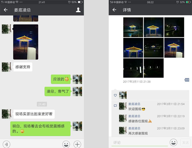 上周六晚上,客戶到現(xiàn)場(chǎng)觀看涼亭亮化效果,被現(xiàn)場(chǎng)美麗的景象給迷住了,忍不住發(fā)了個(gè)朋友圈讓大家也一同欣賞,另外他還特意給我們的業(yè)務(wù)經(jīng)理發(fā)了現(xiàn)場(chǎng)圖片,感謝他的認(rèn)可與支持,也歡迎大家來(lái)電咨詢:18826034118