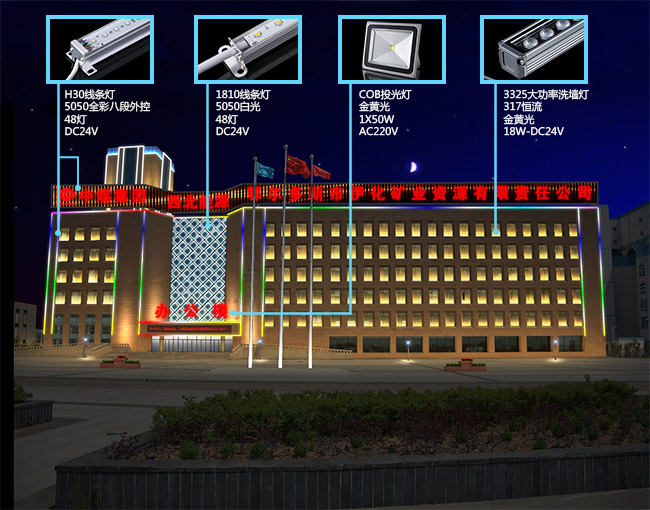 四、窗臺亮化方案:選用了250多米3325金黃光18W洗墻燈作為玻璃面投光燈具,窗臺部份可選用LED窗臺燈完成,客戶通過效果比對后,還是喜歡LED投光燈的亮化效果。