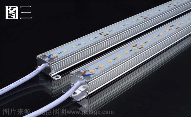 (三)堵頭出線:堵頭出線是從線條燈兩端堵頭片中間開一個出線孔,安裝非常方便。堵頭出線做不到無縫連接,美觀性相對于底部出線而言略為遜色。如圖三所示。