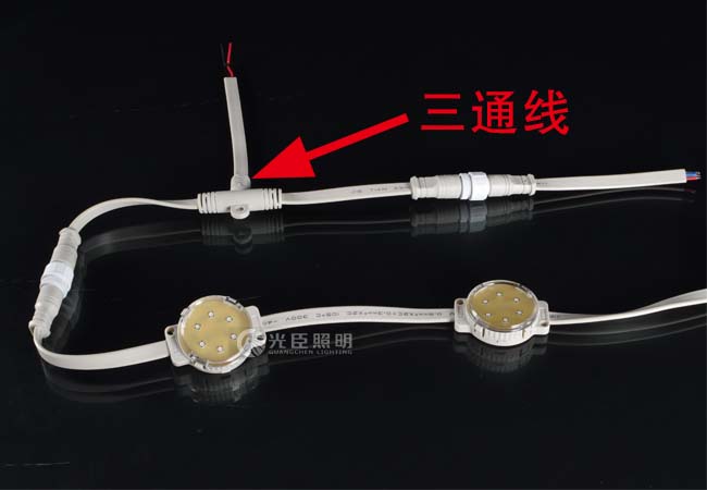 二、三通線串接安裝:每兩串LED像素?zé)舸溆幸粭l與之連接的三通線,延伸出來的三通線可與信號線、電源線相接。安裝極為方便。